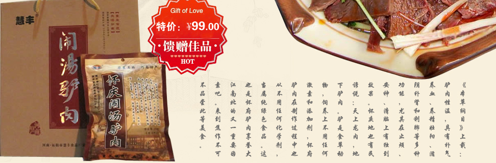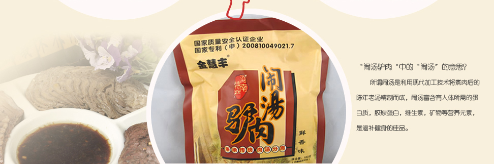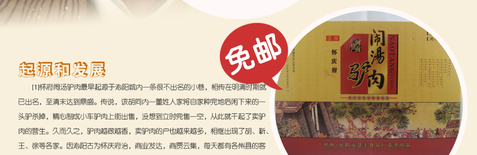 | 怀府闹汤驴肉180克(含汤料)香辣口味 | 沁阳怀府闹汤驴肉208克(含汤料)鲜香口味 |