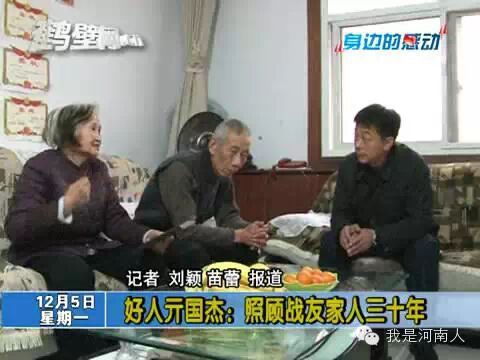 人物简介:亓[qí]国杰,男,河南浚县卫贤镇香菜村人。现任鹤壁国家经济技术开发区金山工业园区、渤海路办事处工委书记。曾参加对越自卫反击战并荣立三等战功、五次受到部队嘉奖。先后三次被鹤壁市委、市政府评为先进工作者;连续11年被评为“优秀共产党员”和“先进工作者”。他从部队复员后30年如一日照顾牺牲战友父母及家人一事,被评为“鹤壁市十大好事”之一;2011年入选中央文明办、中国文明网中国好人榜;2013年3月被省委宣传部、省文明办评为“身边的榜样”;2013年7月被河南省委、省政府、省军区命名为“爱国拥军先进个人”。2014年河南省第四届优秀复转军人年度人物候选人。 “宏贵走了,我就是你们的儿子!” 对亓国杰来说,1979年是刻骨铭心的一年。1979年1月,刚走出校门的亓国杰和邻村比他大两岁的陈宏贵一起参军来到中原野战军某部。远离父母,远离家乡,再加上同在一个部队,这使得两个年轻人的心靠得很近。“虽然宏贵只比我大两岁,却如同大哥一样对我关怀备至”。回想当年,亓国杰感触颇深。 同年的2月份,陈宏贵和亓国杰随部队开往广西,参加了自抗美援朝以来,战争规模最大、投入兵力最多、战况最残酷激烈的对越自卫反击战。2月17日清早,部队发起总攻,在激烈的长条山战斗中,战斗步兵加强一连陈宏贵及其全连战友150多人,一个月战斗结束,伤亡几乎接近一半。战友为国捐躯,男儿泪洒沙场。从战友口中得知陈宏贵牺牲的消息,亓国杰号啕痛哭一场,他怎么也不敢相信,自己的好同乡、亲如兄弟的好战友,就这么没了。 1983年春节前夕,荣立赫赫战功的亓国杰退伍回到家乡。“大年初一究竟去不去给战友宏贵父母拜年,我一时没了主意。去,担心自己的出现会勾起老人的伤心回忆,想起自己的孩子;不去,心里又不安,恐愧对战场上牺牲的战友。”亓国杰回忆说,那年的除夕之夜,他一夜未眠,经过一夜的思想斗争后,他觉得还是得去,一是去安抚一下战友的父母,二是去看看他们家有没有什么困难,自己能够尽点微薄之力。 大年初一,亓国杰早早的就起床去给陈宏贵的父母拜年。一进门,亓国杰按照家乡拜年的习俗给陈宏贵的父母磕了个头,说:“宏贵哥不在了,今后我就是你们的儿子。”不管工作多忙,不管身在何方,每逢春节、中秋等传统节日,亓国杰都会想办法回去看望陈宏贵的父母。每年大年初一,亓国杰都会第一个赶到陈家,给陈宏贵的父母磕头拜年。 30年来,不但每逢节日,亓国杰要去看望老人。而且只要有空,他就抽时间尽已所能到陈宏贵烈士家中看望陈宏贵父母,嘘寒问暖,关怀备至,尽儿女之孝。平时,陈家有大事小情,亓国杰也总当成自已的事尽其能去帮助和处理。陈宏贵父母逢人就讲:国杰不是我的亲儿胜似亲儿。 30年如一日照顾牺牲战友家人 如果说,第一次看望老人是出于对战友的怀念,那么,30年来,这种战友情早已变成了一种浓浓的亲情,一种儿女对父母的牵挂和惦记。30年来,从部队到浚县卫贤镇、淇滨区钜桥镇,再到开发区管委会金山工业区,亓国杰工作的地点和岗位变了很多次,但照顾战友父母始终没有变。亓国杰说这么多年去看望、照顾老人,已经成为了一种习惯和他生活的一部分。 陈宏贵母亲姜好梅的腿患有风湿病,亓国杰托人从上海给老人买来膏药。老人天天在家,腿疼得不能走路。亓国杰知道后给她送来轮椅,不忙的时候,就推着老人四处转转。陈宏贵的父亲陈清新老人得了胸膜炎。陈宏贵的弟弟陈峰赶紧给亓国杰打电话,亓国杰送老人去郑州住院,给老人喂水、喂药。陈清新说:“三十年了,国杰一直照顾我们,没有间断过,就是自己的亲生儿女也不过就是这样吧。” 陈宏贵牺牲的时候,弟弟陈峰还是个三岁的孩子,在陈峰的记忆里,对哥哥陈宏贵没有什么印象。倒是从记事起,是亓国杰一直照顾着父母、照顾着他们的家。陈峰说:“俺哥牺牲的早,国杰哥这么多年照顾俺父母,从我内心说,他就像俺亲哥一样,虽然俺不是一个姓,但胜似俺亲哥。” 30年来,陈宏贵的弟弟妹妹们印象最深的就是每年的大年初一,父母都会亲手做几样小菜、放两个酒杯,就像是等着远方的儿女回家一样,等着亓国杰。没有看到亓国杰之前,两位老人哪里都不去。这些年来,在陈宏贵父母的心里,亓国杰就是他们的儿子。 亓国杰在开发区管委会工作时,每天按时上下班,每周都会去看望陈宏贵的父母,陪老人聊聊天,帮忙干些家务;农忙的时候,到地里帮着收秋种麦。自从亓国杰担任鹤壁国家经济技术开发区金山工业园区、渤海路办事处工委书记以来,他带领园区工作人员全心全意服务企业,为企业办实事,帮助企业解决实际困难。他们最爱说的一句话就是:有困难找园区。在他们心里,园区就是他们的家。不管遇到大事还是小事,只要找到园区,就一定能够解决问题。 从此,亓国杰就没有了节假日,甚至遇到有些企业出现紧急情况,他半夜还要到现场去处理协调。但不管工作有多忙,不管身在何方,每逢节假日,他都会想办法回去看望陈宏贵的父母;他知道陈父爱喝酒,每年春节都会带上好酒陪他喝上几杯。30年如一日,亓国杰与陈家的情谊,早已成为一种浓浓亲情,这种亲情也渐渐变成了一种习惯。他们都已经习惯了彼此风霜雪雨时的嘘寒问暖,习惯了困难坎坷时扛起彼此肩膀上的责任。 提起这些事,亓国杰总是说:“战友在战争中去了,长眠在南疆,是