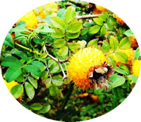 刺梨为野生小灌木,四至六月开粉红色、红或深红色的花,夏花秋实。果实多为扁圆球形,横径一般为二至四厘米,八至九月果实成熟,黄色,有时带红晕。果肉脆,成熟后有浓芳香味。果皮上密生小肉刺,俗称之为“刺梨”。果实内含有丰富的维生素C,每百克鲜果的可含部分一般含维生素C二千毫克,因此被称之为“维C之王”;单宁五百至一千毫克;含酸一至二克;总糖量一般四克左右。