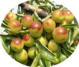 冬枣 冬枣属于鼠李科,枣属。是无刺枣树的一个晚熟鲜食优良品种。冬枣结果早,嫁接当年 就能结果,10月上中旬成熟,果实近圆形,果面平整光洁,果形酷似小苹果。纵经2.7-2.9cm,横经2.5-2.9cm,平均单重14克,最大果重45克。 主要分布在河北、山东等地。冬枣果大,近圆形,纵横径2.9—3.2厘米,皮薄,核小,汁多,肉质细嫩酥脆,甜味浓,略酸。果实圆形或扁圆形,呈赭红色,平均单果重17.5g,最大单果重35 g,枣核呈纺锤形。鲜枣含糖量34%,含酸量0.47%,含维生素C303mg/100g。 冬枣树势中庸,发枝力中等,定植后2—3年结果,高接后第二年结果,稳产。果实生育期125—130天。从9月下旬(白熟期)至10月中旬(完熟期)可陆续采收。